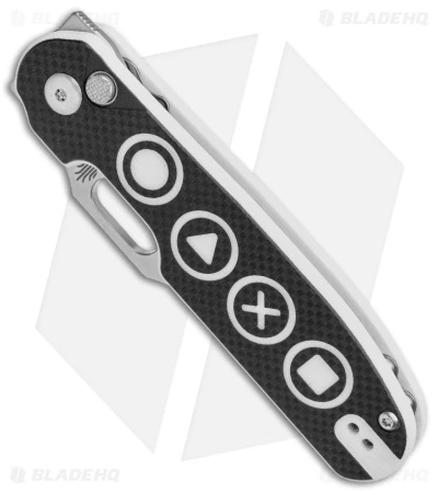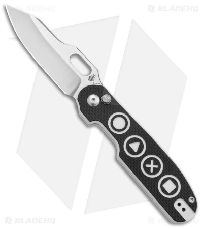 - Video game button textured black and white G-10 handle scales.
