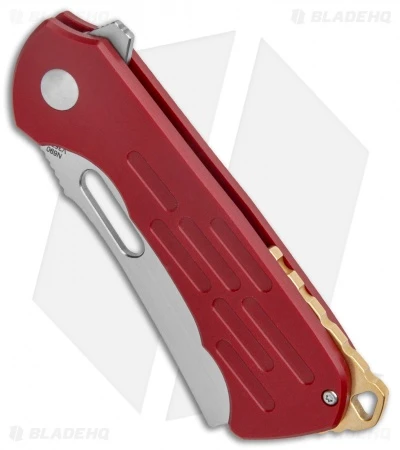 - Textured, red G-10 handle with a gold anodized backspacer.