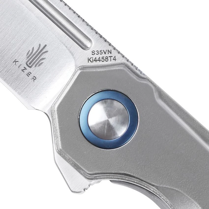 Model/Part Number – KI4458T4. Kizer Begleiter Framelock Ti. 4.5″ (11.43cm) closed. 3.5″ (8.89cm) satin finish S35VN stainless tanto blade. Gray titanium handle. Extended tang. Lanyard hole. Pocket clip. Black nylon pouch. Boxed. Made in China.